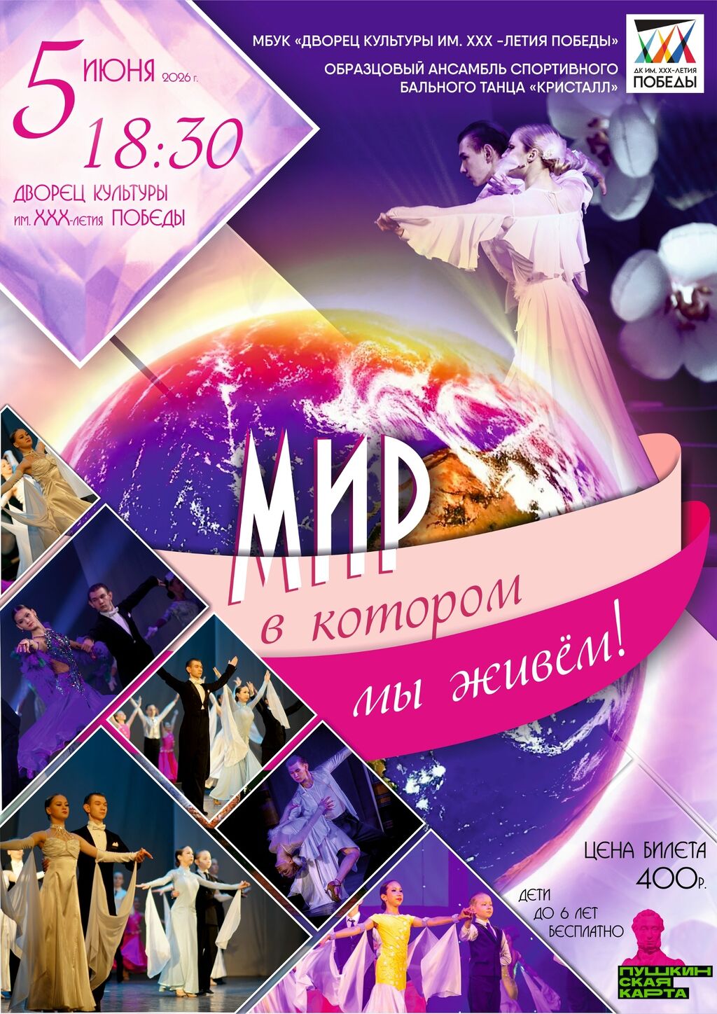 5 июня в 18:30 Отчетный концерт Образцового ансамбля бального танца "Кристалл" "Мир в котором мы живем!" Большой зал Вход: по билетам Возрастные ограничения: 6+ |